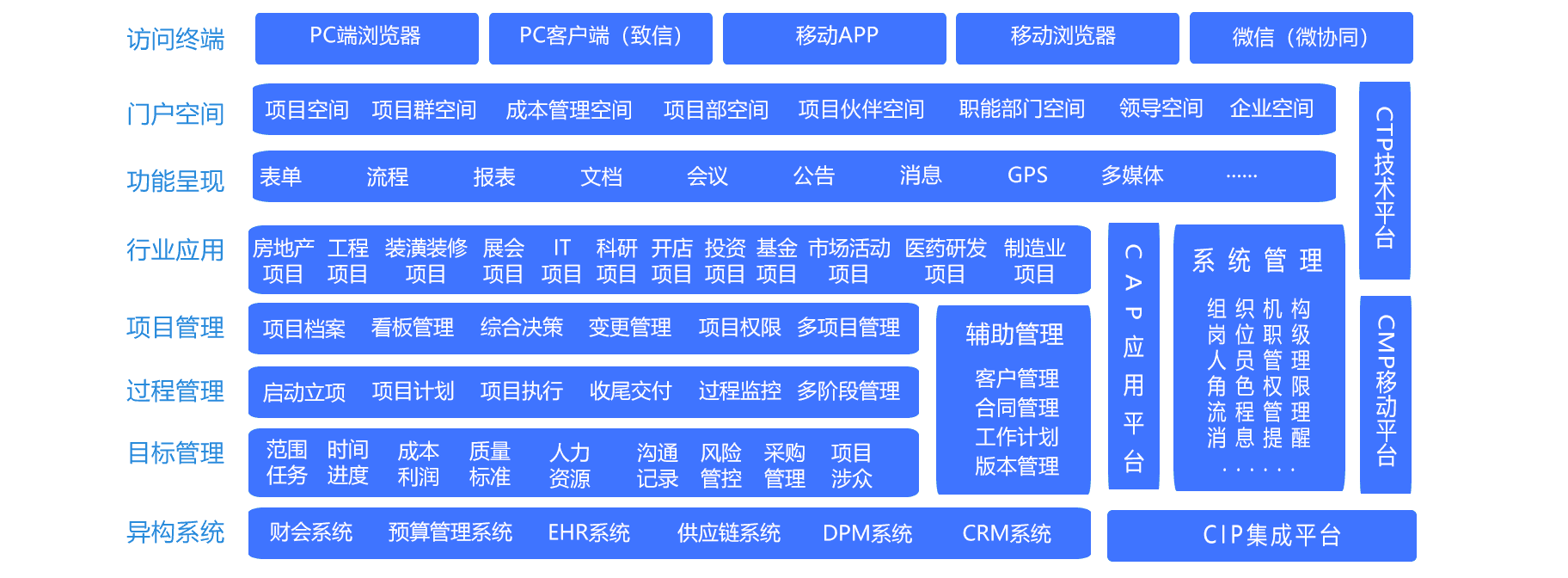 传统项目过程中不同工作需多平台操作,而协同项目管理是打造平台统一的业务应用集群,避免项目过程中用户需在多个系统中处理工作的处境,实现纵向业务流程与横向审批流程相结合的管理手段
