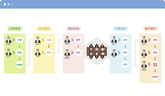 用于会议通知、会议资料的发出、会议室的查看,到时提醒,对参会情况的事先了解,会议纪要的总结和归档等。